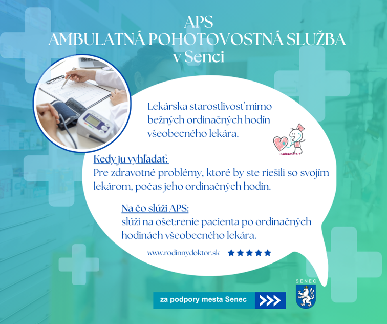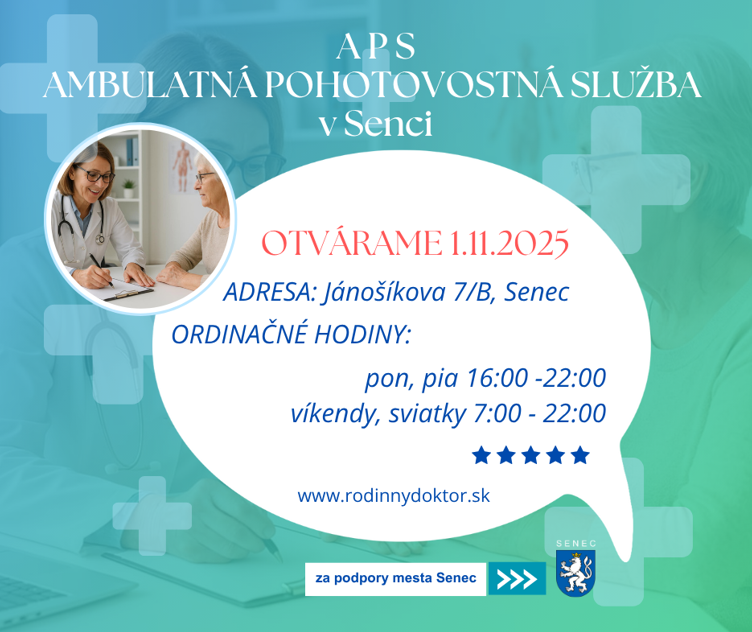 Dovoľujeme si Vás informovať, že od 01.11.2025 v Senci otvárame novú Ambulantnú pohotovostnú službu (APS) pre dospelých.
